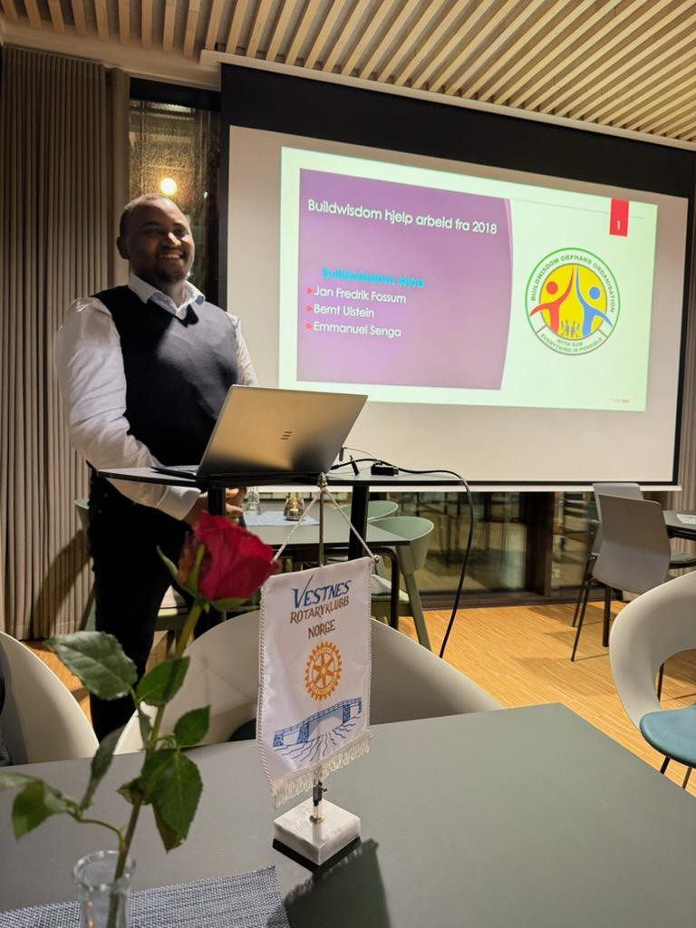 På kveldens møte fikk Rotarymedlemmer et sterkt og inspirerende innblikk i arbeidet med prosjektet Build wisdom in Uganda. Emmanuel Senga delte historien og sitt engasjement for å gi foreldreløse barn et verdig liv.