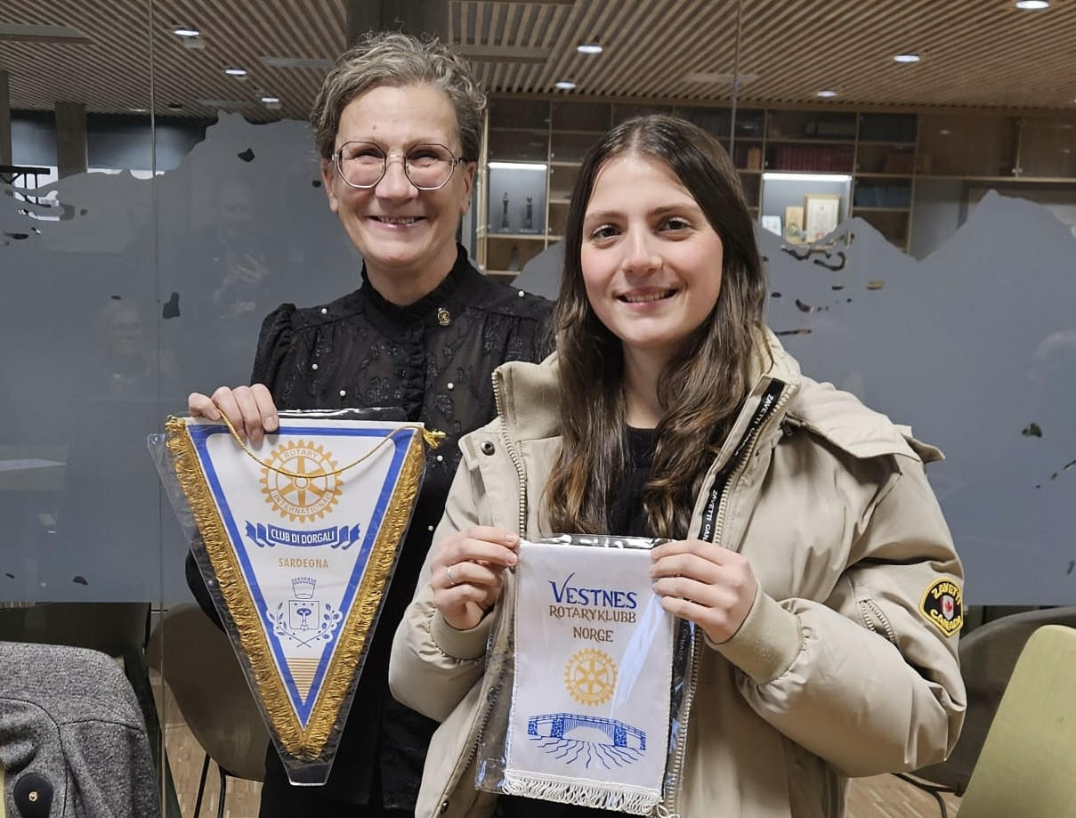 I kveld har vi hatt årsmøte i Vestnes Rotaryklubb. Men før vi startet årsmøtet fikk vi overrakt en fin klubbvimpel fra vår utvekslingsstudent Michela og hennes klubb på Sardinia, "CLUB DI DORGALI SARDEGNA". Og Michela fikk med seg en vimpel fra Vestnes Rotaryklubb.